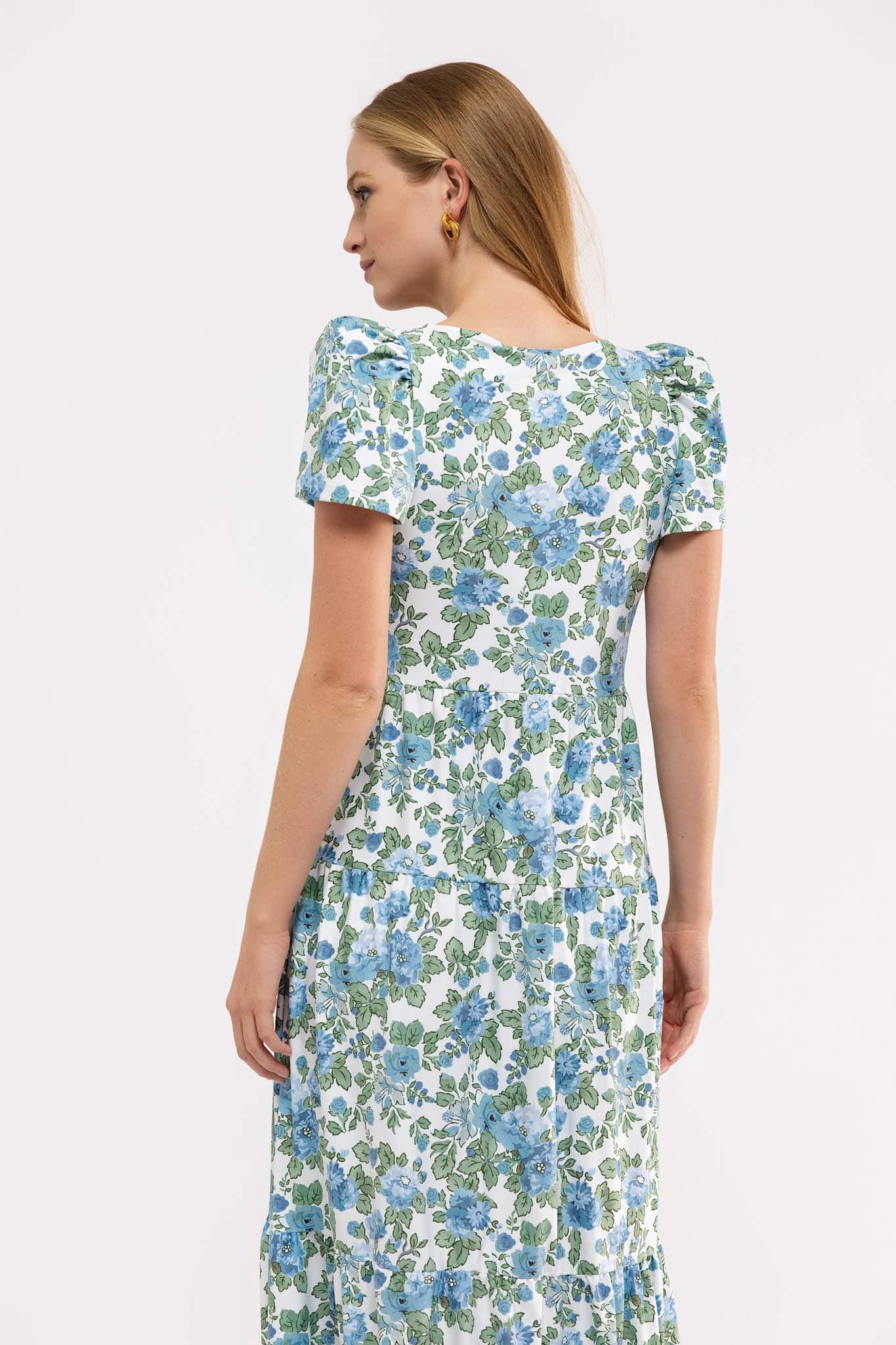 V-neck •  Short sleeve •  Decorative buttons •  Tiered A-line skirt