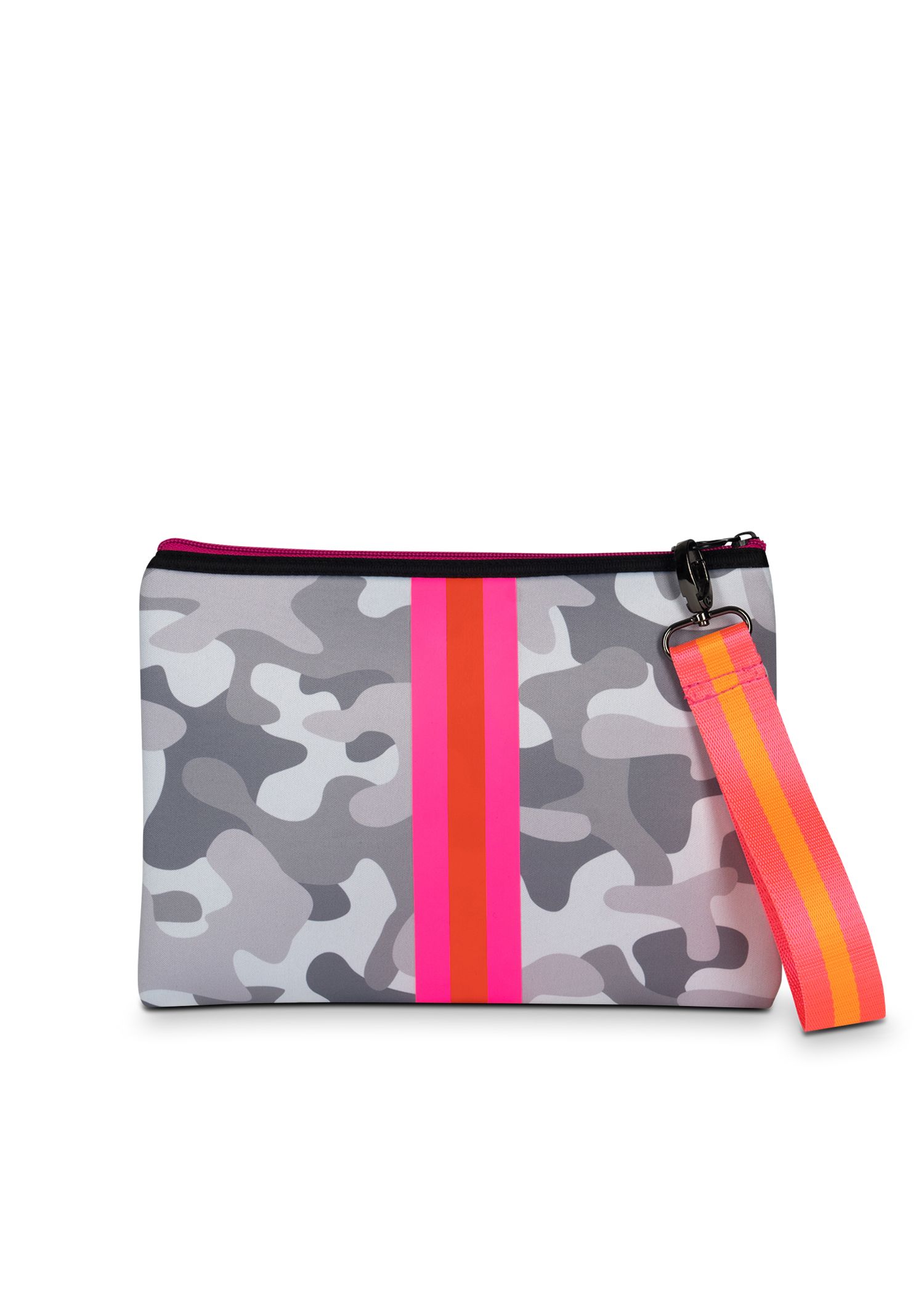 White camo/pink & orange stripe. Striped wristlet and gunmetal chain wristlet.