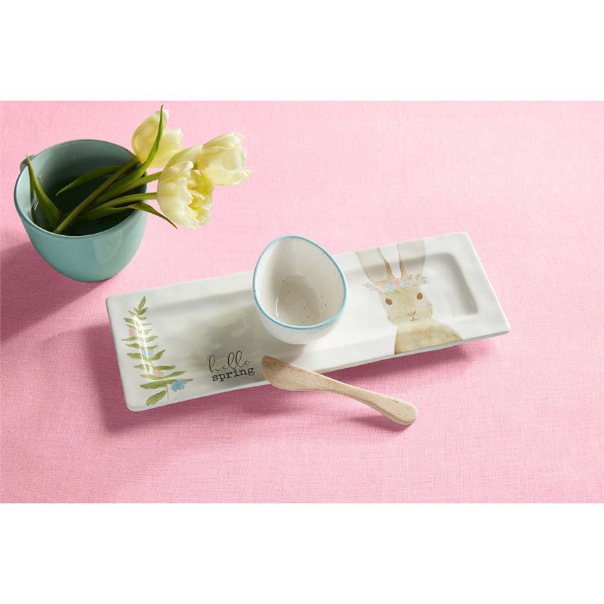 This three-piece Bunny and Egg appetizer tray set is perfect for Easter serving. This set comes with a ceramic watercolor tray that features bunny and “Hello Spring” wording. The tray comes with a hand-painted egg shaped dip cup and wooden spreader. The tray measures 4 1/2″ x 13″. The cup measures 3 3/4″ x 3″ while the spreader measures 6″.Â