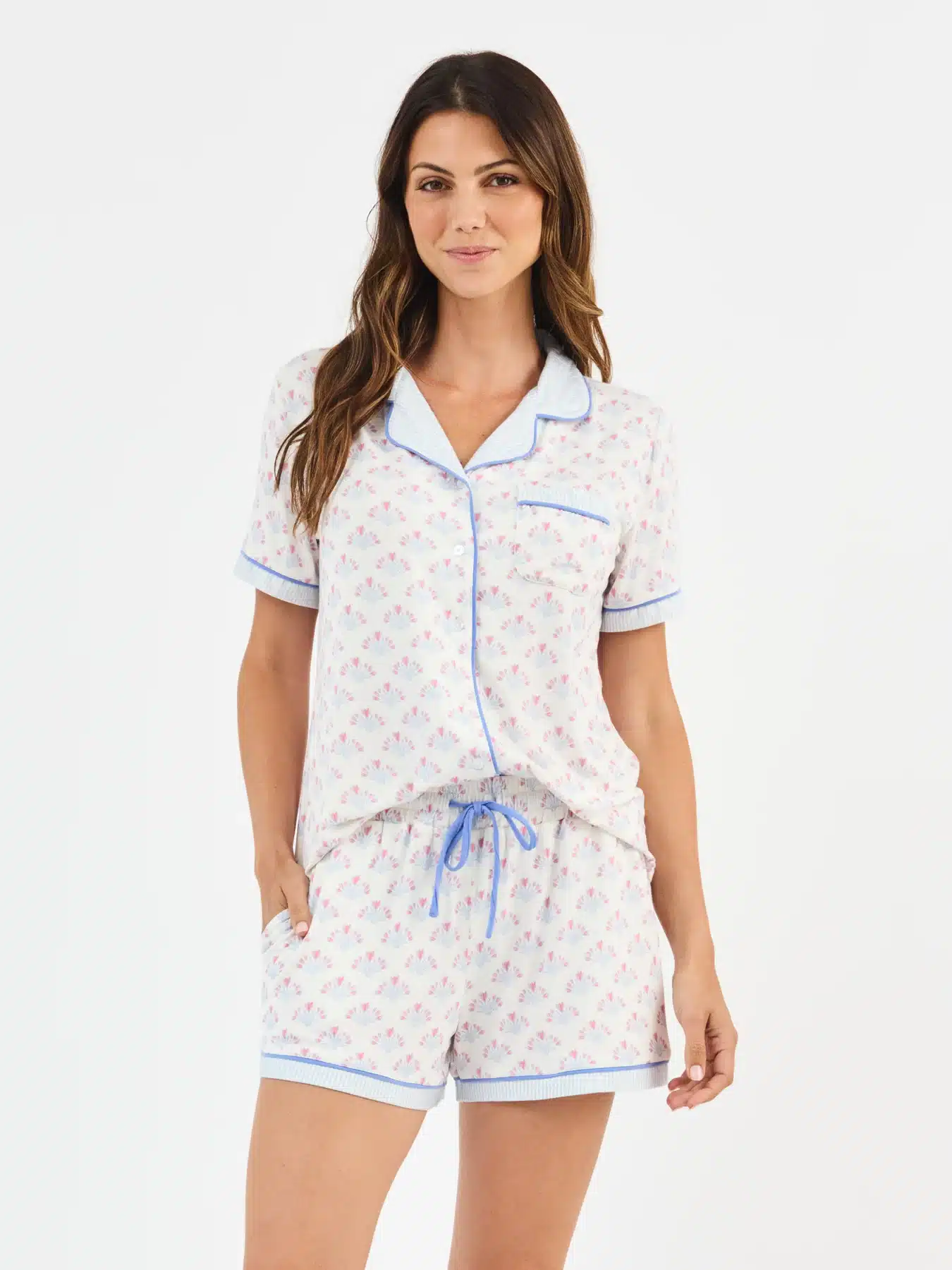 Enjoy the luxurious comfort of the Charlotte Shorts Set. This effortlessly elegant set includes a button-front top with a classic collar and adjustable drawstring shorts for a perfect fit.