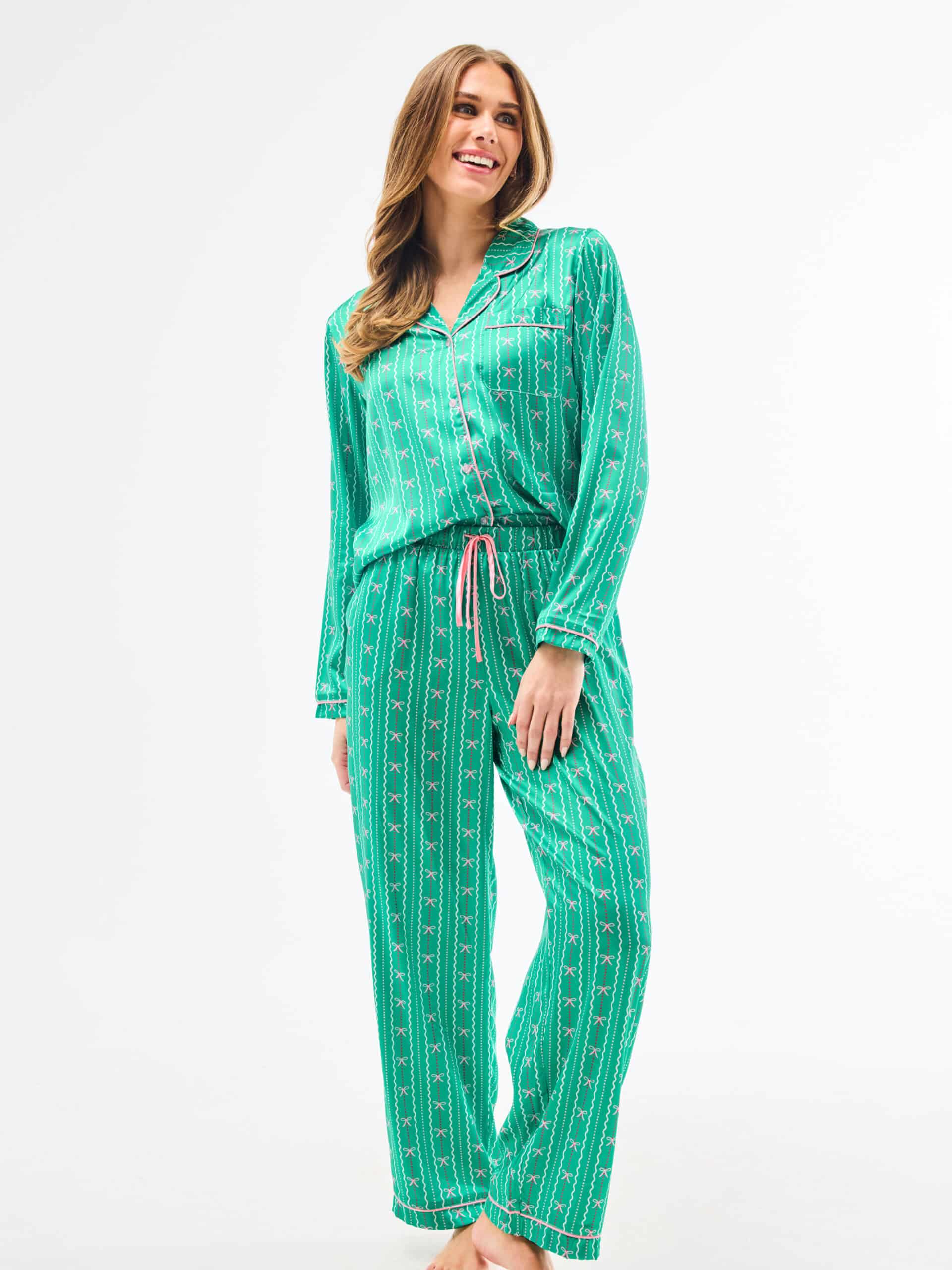 Introducing our Holiday Charlotte Satin Pajama Set, where luxury meets cozy relaxation. Perfect for sipping cocoa by the tree or enjoying Christmas morning in comfort, this pajama set brings festive elegance to every moment. Featuring a button-front top with a classic collar and straight-leg pants with an adjustable drawstring, our Charlotte Satin Pajama Set combines timeless style with all-day comfort.