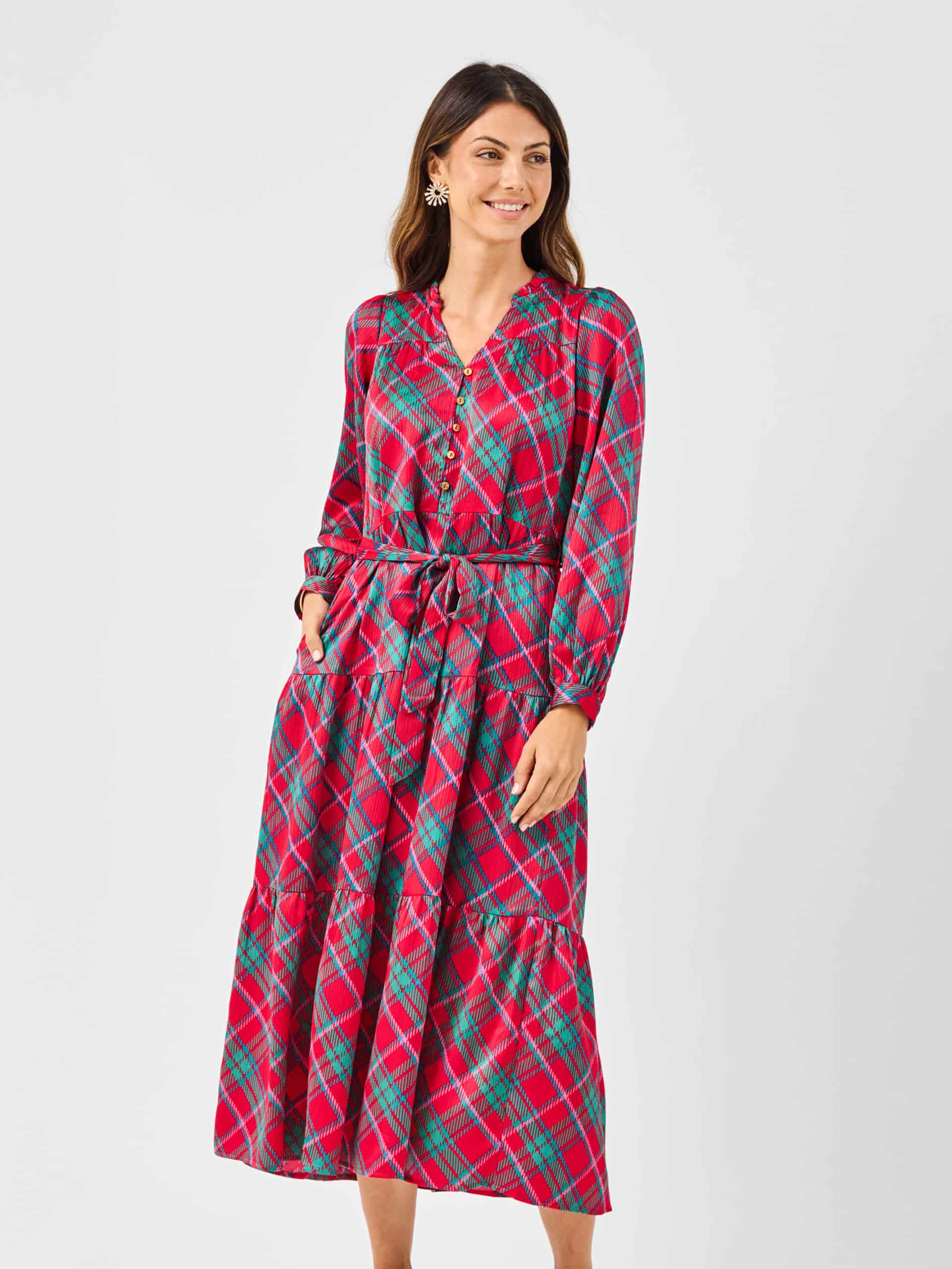 Step into holiday elegance with the Gracelyn Dress, a perfect blend of classic charm and modern details. The delicate ruffle split V-neckline adds a soft, feminine touch, while long sleeves finished with button cuffs offer refined sophistication. Designed with a removable tie belt, you can easily create a flattering silhouette tailored to you.