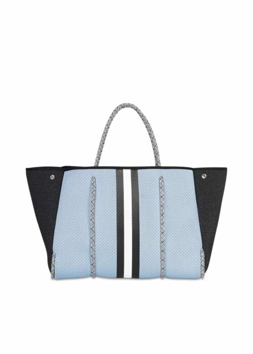 Light Blue, white and black. This neoprene tote is the perfect blend of style and functionality.