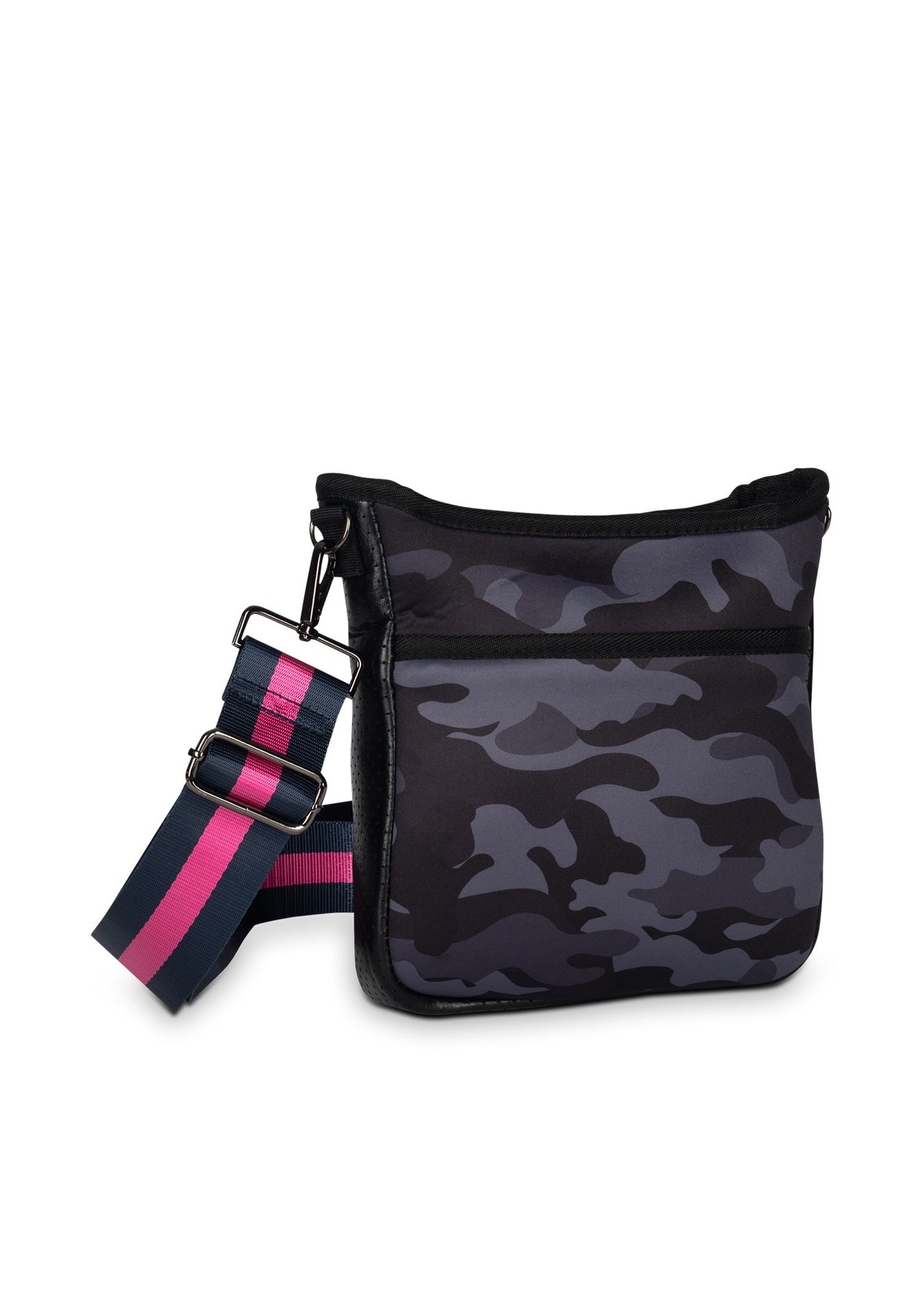 Navy camo with coated black side panels.ย Solid blackย & navy/pink striped straps.