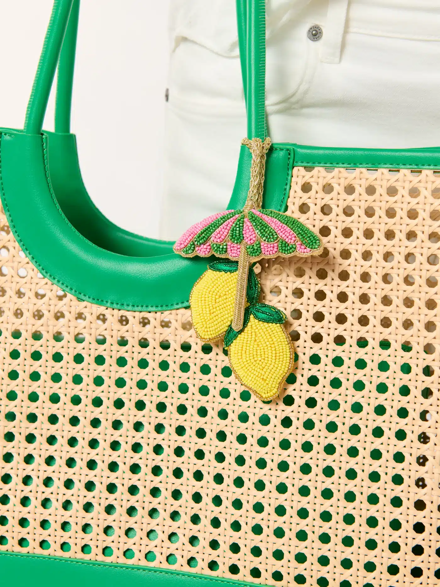 Add a citrusy twist to your bag with our Lemon/Umbrella Beaded Bag Charm. Featuring two bright yellow lemons paired with a pink and green umbrella, this charm instantly brings vacation vibes to any tote or handbag. Vibrant glass beads catch the light and make every detail pop with personality. Just loop it on and let your accessory do the talking—sunshine and style included!