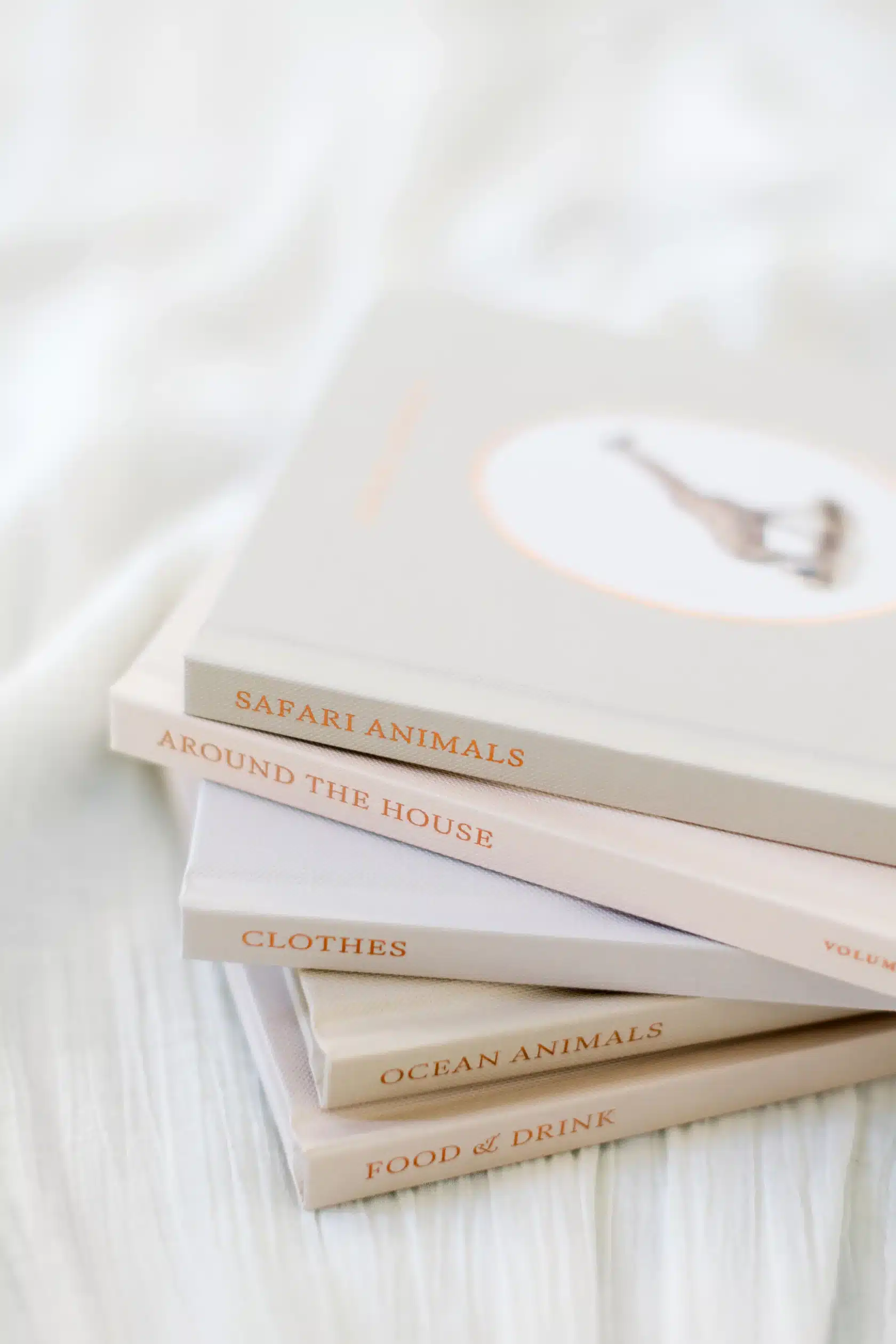 Our Little Library Vol II. includes five board books featuring foundational words from the following categories: Ocean Animals, Safari Animals, Food & Drink, Clothes, Around the House.