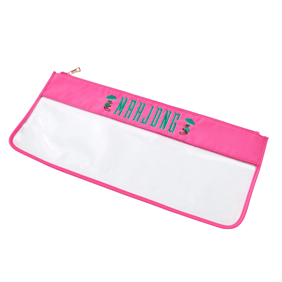 Get ready to mahj in style with the Pink Monkey Zippered Bag! In a bold neon bubblegum pink with vibrant rich teal embroidery, this playful bag is framed by two adorable matching monkeys, adding a fun, cheeky vibe to your game night. It’s as functional as it is fabulous, with a spacious interior, secure zipper closure, and a clear bottom section to show off your tiles in style. Perfect for those who love to make a statement while keeping their game essentials safe and sound!