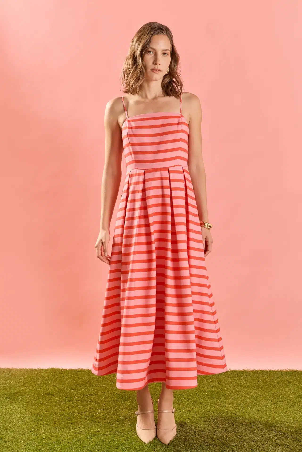 Bold yet effortlessly refined, the Striped Pleated Midi Dress is designed for warm-weather moments. Featuring a clean straight neckline and adjustable spaghetti straps, this silhouette offers a flattering, customizable fit. The structured pleated skirt creates beautiful volume and movement, while the vibrant horizontal stripes add a playful statement. Perfect for summer outings, vacations, or garden gatherings, this midi dress blends comfort with standout style.