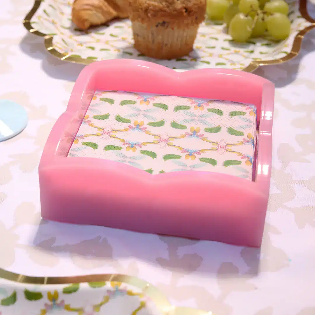 Our Palm Scalloped Acrylic Cocktail Napkin Holders are bold, bright, and ready to party. Designed in collaboration with Laura Park Designs for the Cabana Collection, these glossy acrylic holders keep cocktail napkins neat while adding a splash of color to your bar cart, buffet or poolside.