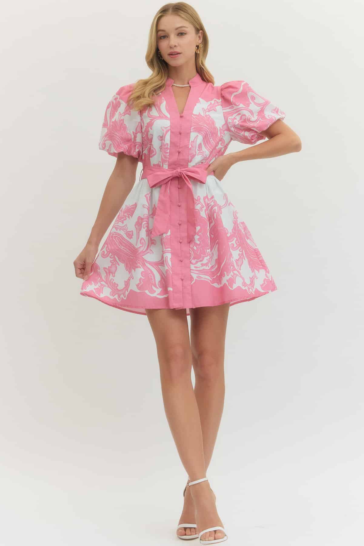 Pink Patterned Puff Sleeve Mini Tie Dress