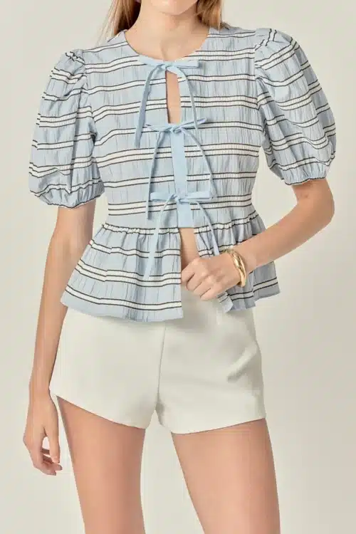 Romantic charm meets playful detail in this Bow Front Puff Sleeve Top. Designed with soft volume and subtle structure, this feminine silhouette features a round neckline, gathered puff sleeves, and delicate bow ties that cascade down the front. The peplum hem, finished with gentle shirring, adds movement and shape to the waist. Whether dressed up or styled casually, it brings a whimsical, French-inspired touch to any outfit.