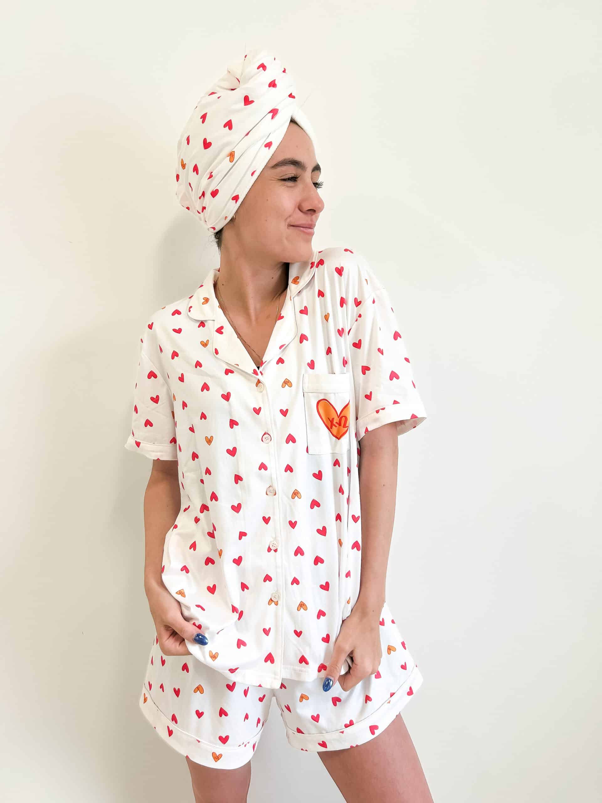 Covered in adorable hearts featuring your sorority’s colors and Greek letters, it’s the perfect post-shower essential or self-care moment accessory!