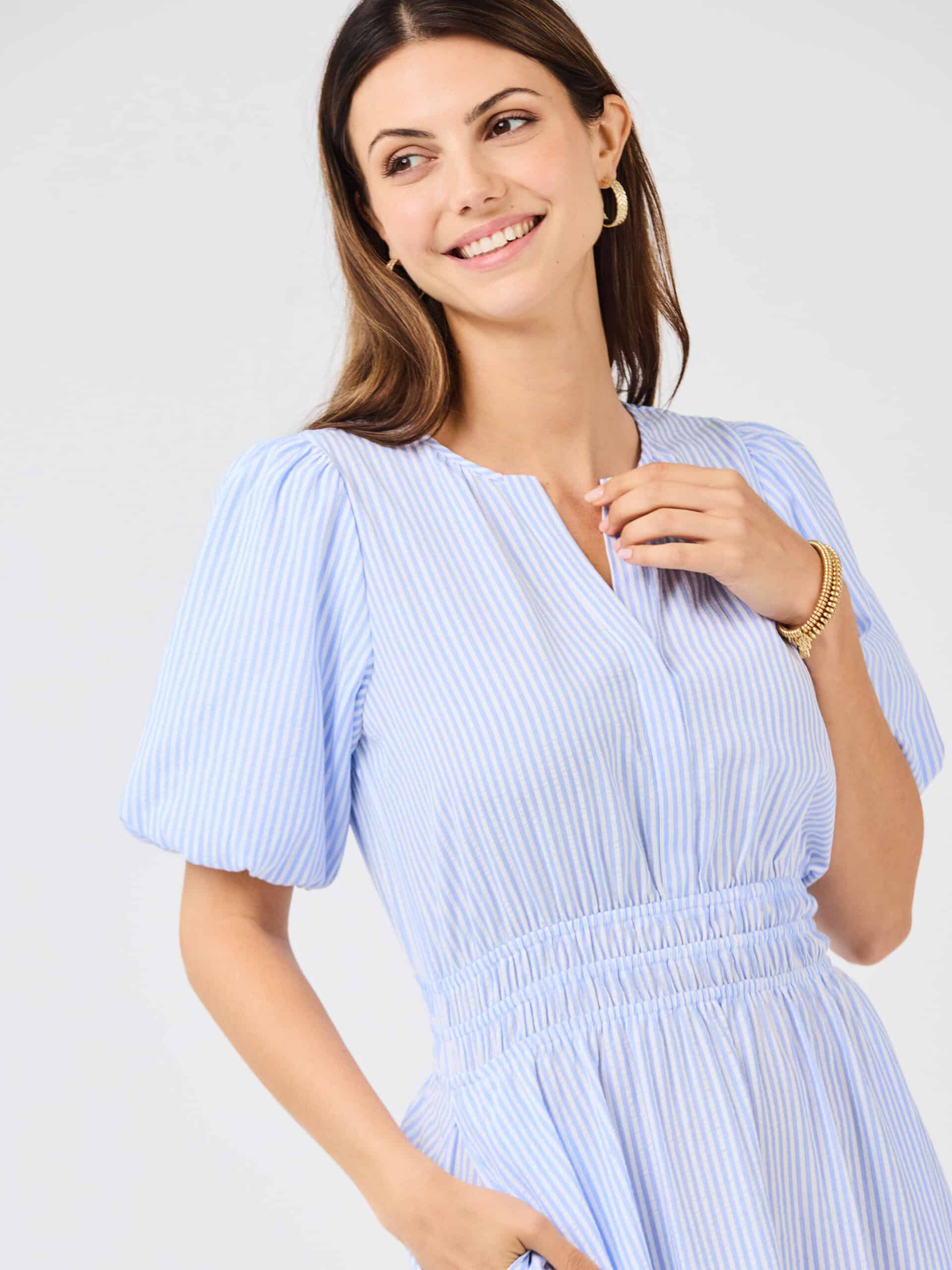 The Tracey Dress is an effortless favorite with feel-good details throughout. A split V-neckline and softly puffed sleeves add a touch of charm, while the smocked waist creates a flattering and comfortable fit. Finished with a tiered hem for easy movement and pockets for everyday practicality, this dress is made for days when you want to look put-together without trying too hard.