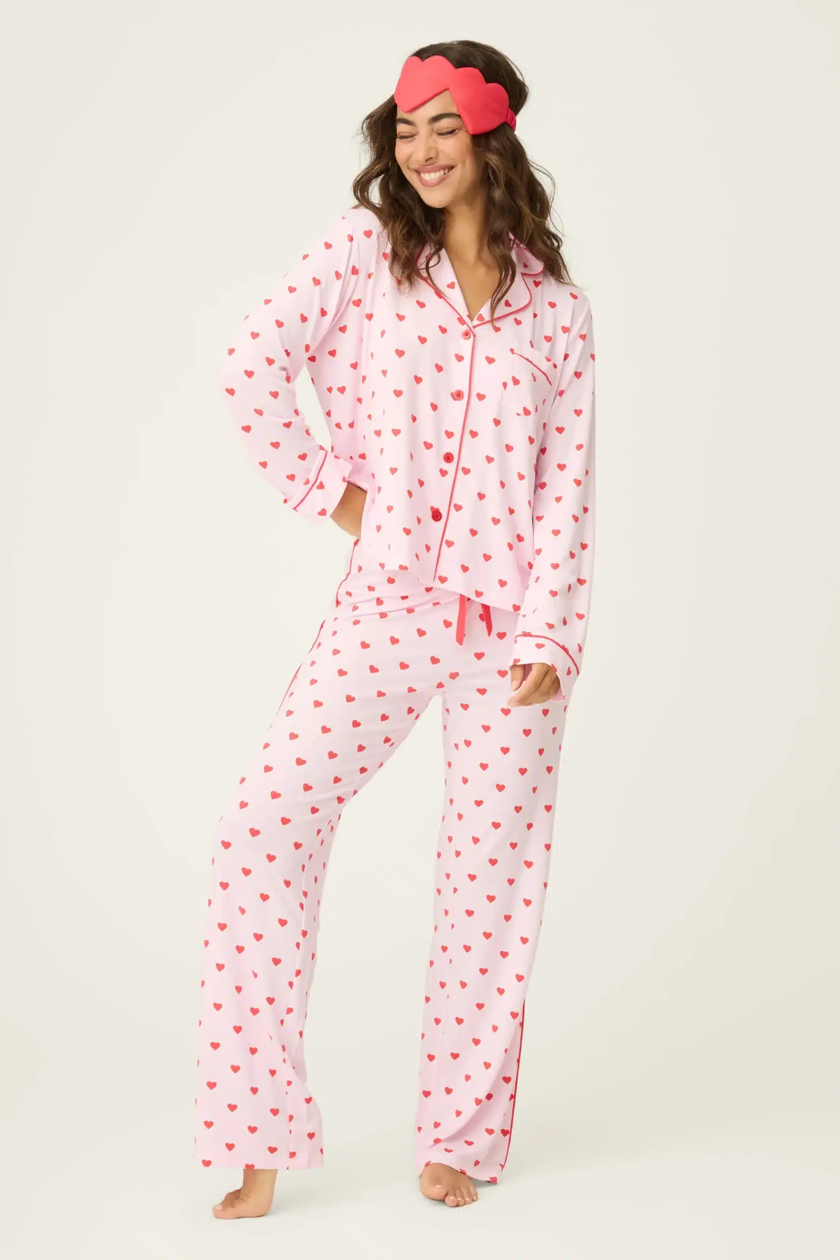 Cue the heart eyes. This three-piece pajama set features a button-down top and relaxed pants in pink modal jersey sprinkled with red hearts. The matching eye mask seals the dealโliterally. Equal parts cozy and cute, itโs love at first lounge.