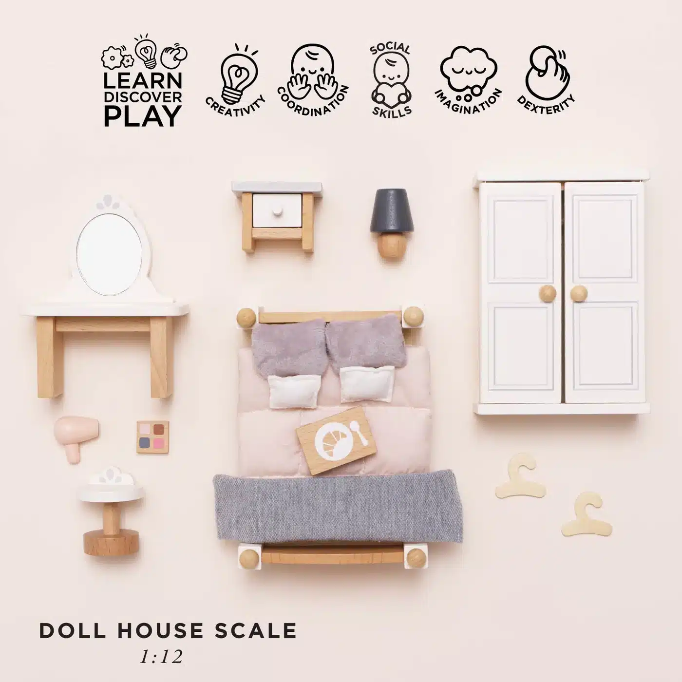 This sweet miniature bedroom accessory set is a real dream come true. With a classic design in lovely neutral tones, it is compatible with all of our beautiful wooden dolls houses and makes a stunning addition to any child’s small world play universe.